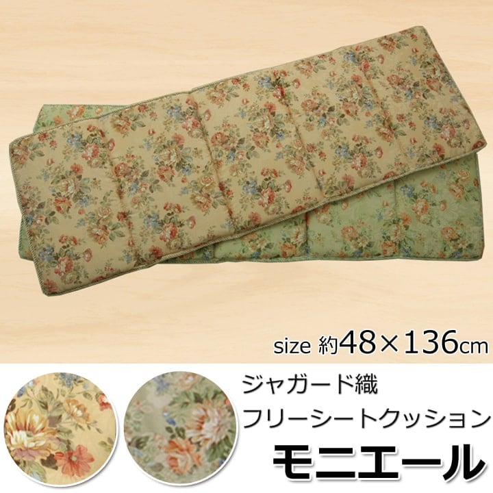 エレガンス柄のクッションです。人気の柄で洋室にもぴったりの商品です。表地にはジャガード織の生地を使用しているため繊細な柄と上品な風合いが特徴の商品です。国内で綿入れ加工をしているため程よいクッション性があります。ベンチタイプの椅子にぴったりの商品です。