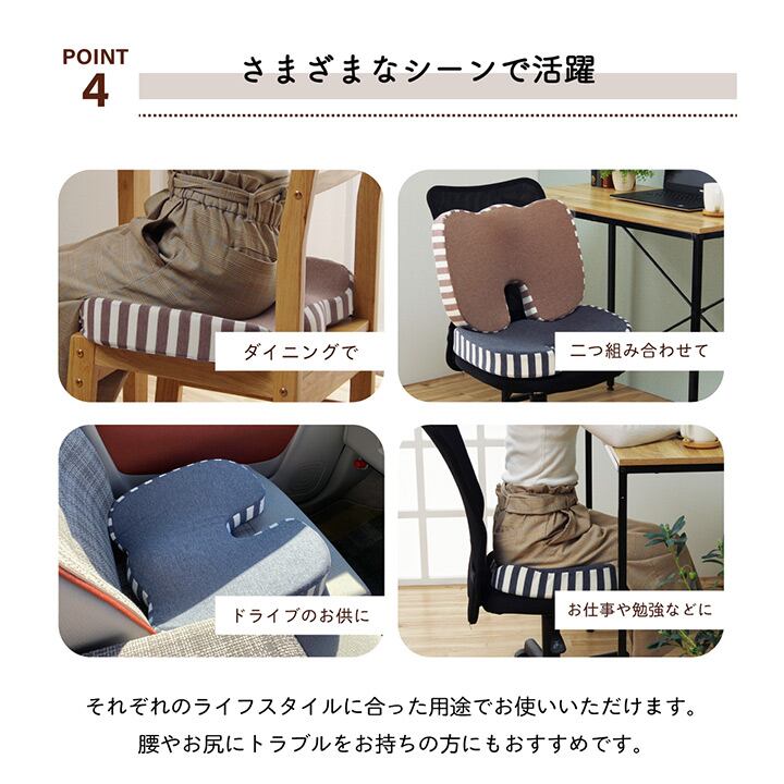 オフィスワークやドライブなど長時間座りっぱなしの時の負担を軽減してくれます。もっちり低反発で身体にぴったりフィットして、美しい姿勢をサポートしてくれます。シンプルなデザインで場所を選ばず、オールシーズンご使用頂けます。