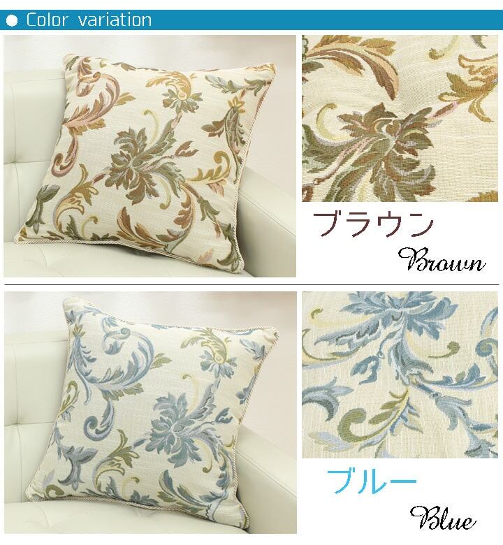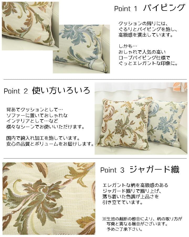 エレガンス柄のクッションです。人気の柄で洋室にもぴったりの商品です。表地にはジャガード織の生地を使用しているため上品な風合いのある商品です。