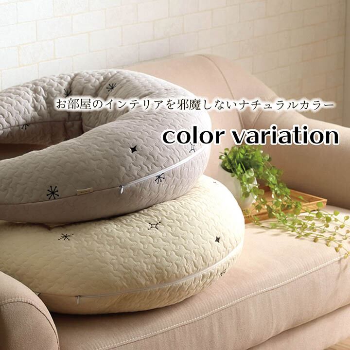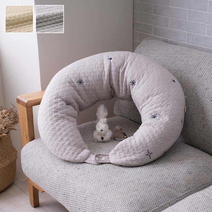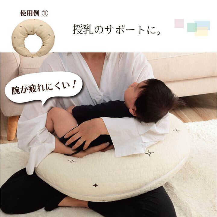 長く使える2wayタイプのマルチクッションです。肌に触れるものだから肌触りのいいコットン100%の表地です。1日に何度もある授乳タイムをしっかりとしたボリュームで赤ちゃんの授乳をサポートします。赤ちゃんのお座り期には腰の支えとしてもご使用いただけます。スナップボタンを外せば抱き枕としてもご使用いただけます。洗えるカバーとクッションで清潔を保つことが出来ます。オリジナルバッグ付きです。
