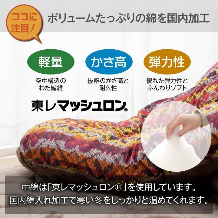 落ち着いたデザインと色味で温かみを感じるこたつ布団です。中綿に東レマッシュロン綿を使用,とても軽量な上に,ふんわりと弾力性に富んでいます。表地にはポリエステルピーチスキンを使用しています。裏地は肌触りがなめらかで温かみのあるフランネル素材を使用しています。