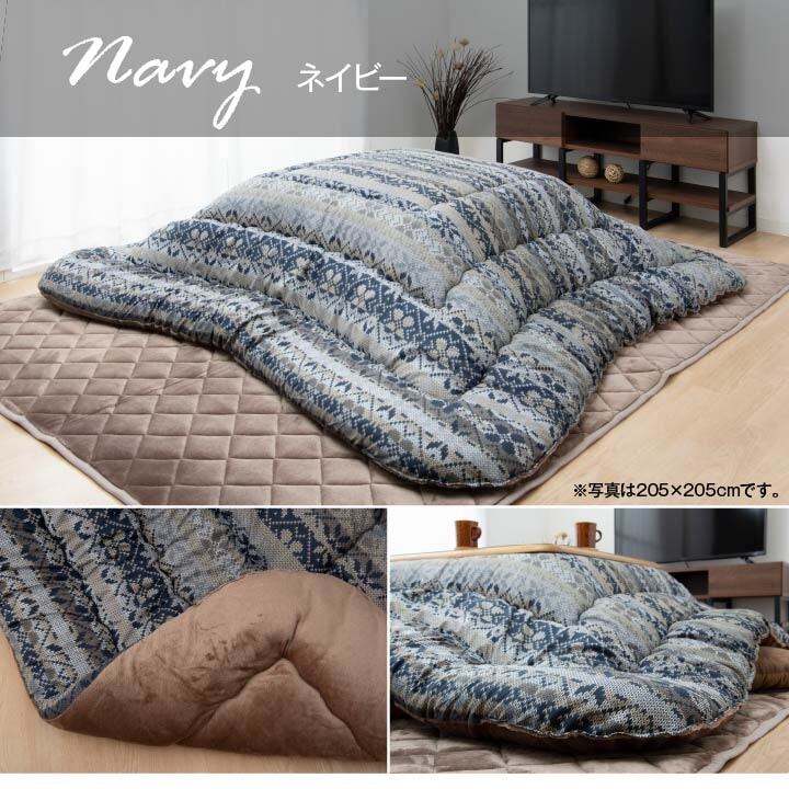 落ち着いたデザインと色味で温かみを感じるこたつ布団です。中綿に東レマッシュロン綿を使用,とても軽量な上に,ふんわりと弾力性に富んでいます。表地にはポリエステルピーチスキンを使用しています。裏地は肌触りがなめらかで温かみのあるフランネル素材を使用しています。