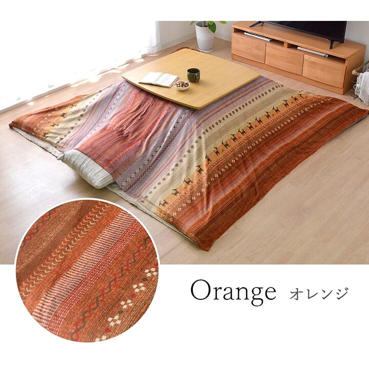 かわいらしいギャッベ柄をモチーフにした大人かわいいこたつ布団上掛けです。繊細なプリントが特徴です。表地には肌触りのよい短毛のマイクロファイバーを使用しています。お手持ちのこたつ布団にさっと掛けるだけでお部屋の雰囲気を変えるのにも役立ちます。部分暖房のコタツは電気代もおトクです。