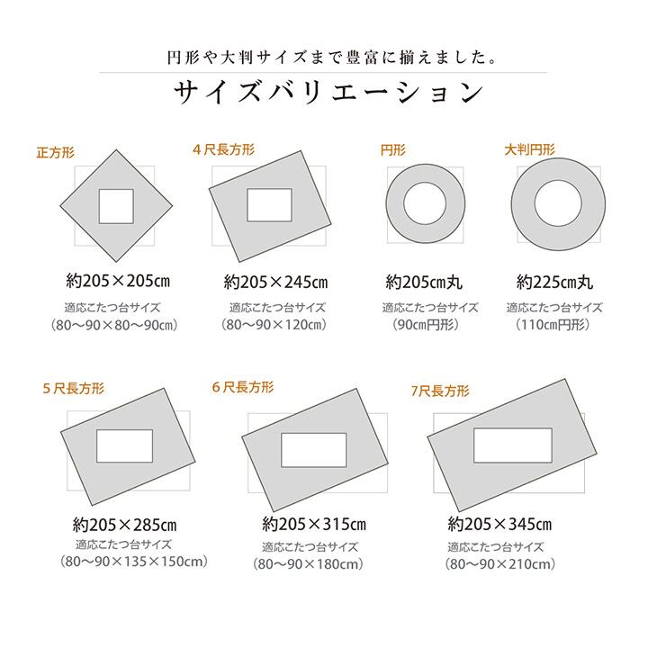 サイズ展開も7サイズととても豊富。スタンダートな四角のこたつ台5サイズから円形のこたつ台2サイズまで揃えています。