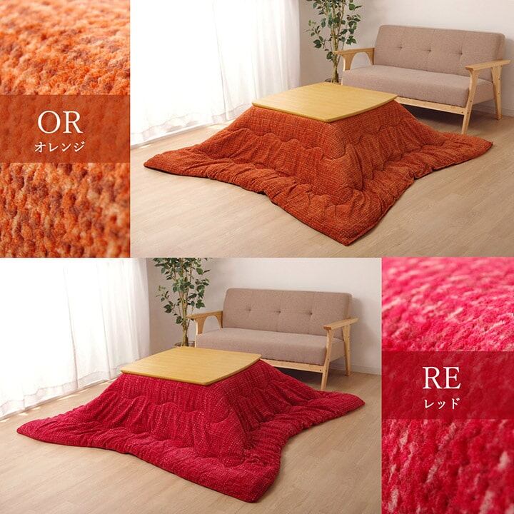 あたたかみのあるカラーを使用したこたつ布団です。表地は凹凸感を持たせポコポコとしたタッチ感が特徴です。裏地にはなめらかな肌触りのフランネルを使用しています。薄手なので折りたたんでもかさばらず、コンパクトに収納できます。布団の内側に紐をつけることにより、布団と台がずれないようにしました。部分暖房のコタツは電気代もおトクです。