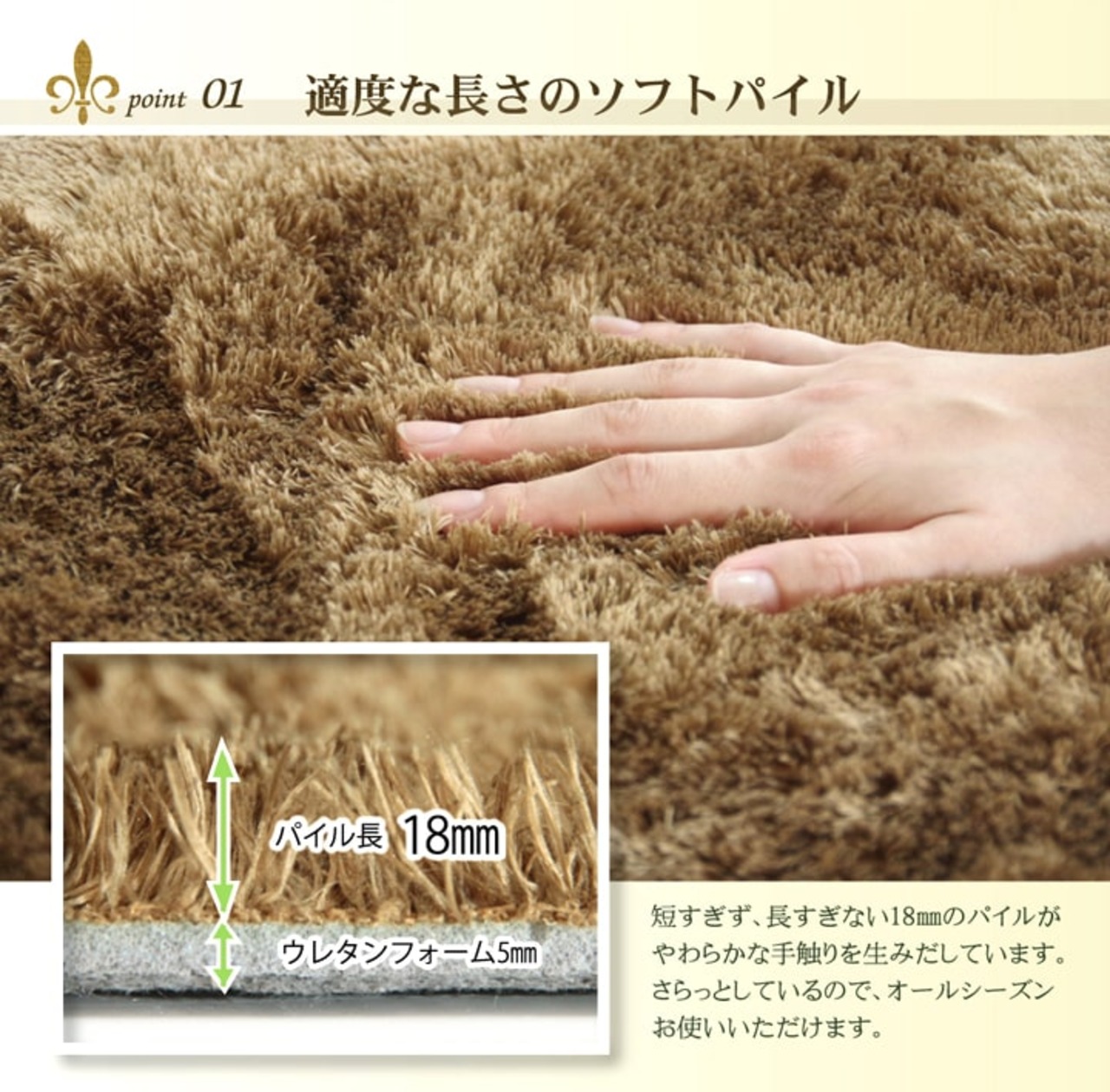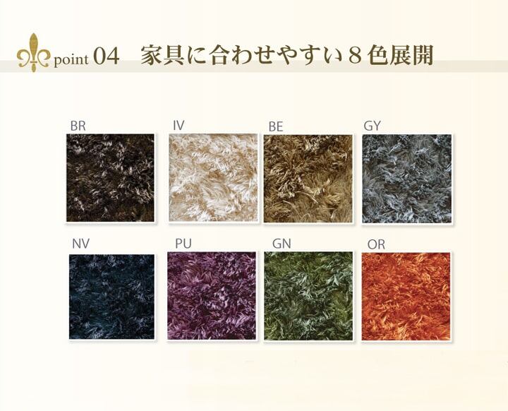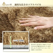 シャギー調の毛足は約18mmでふかふかとした感触とさらさらとした肌触りがとても気持ちいい商品です。