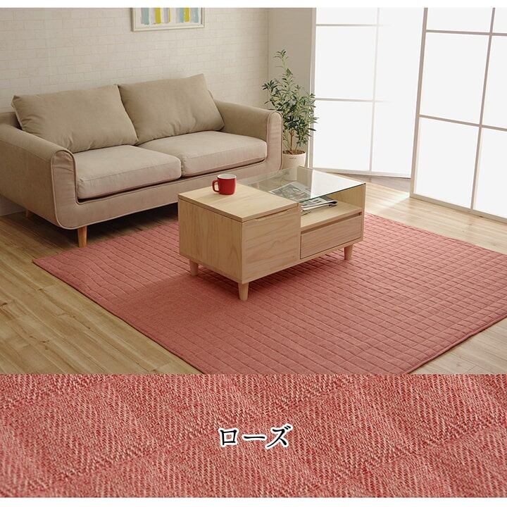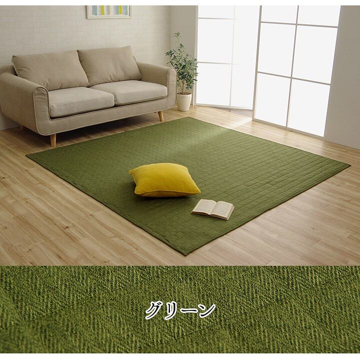 スタイリッシュな無地のキルティングラグカーペットです。キルティング加工をすることで、中わたが寄ったりズレたりしにくく、立体感とボリューム感が出ます。表地に若干の光沢をプラスすることで、シンプルなのにおしゃれで高級感のある雰囲気に仕上げました、また、サラッとした肌触りの生地を使用していますので、季節を選ばず年間ご使用頂けます。中材にはウレタン5mmを使用していますので、適度なクッション性があります。ホットカーペットカバーとしてもご使用頂けます。ご家庭の洗濯機で洗える(ネット使用)ので清潔にご使用頂けます。※滑りやすい床面等でご使用される際には、市販の滑り止めを敷いて下さい。