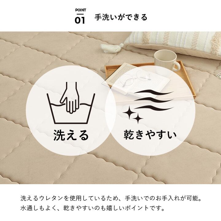 中材は洗えるウレタンを使用しているため、手洗いでお手入れ可能。水通しの良いウレタンなので、乾きやすいのもうれしいポイント。