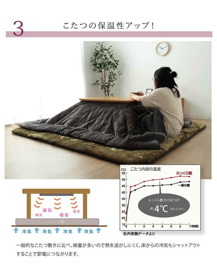 カービングを施した、立体感のある商品です。洋室にも和室にもご使用いただけます。中材にはクッション性にこだわった国産の固綿40mmを使用しています。十分な弾力性があるのでフローリングでのご使用にも最適です。
