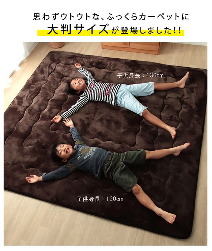 こたつ布団でごろんと横になりゆっくり過ごしたい方にお勧めのこたつ布団敷きです。通常よりも30cmほど大きくすることでこたつ布団に入ったままごろんと横になっても体がはみ出にくい大きさにしました。中綿には固綿を30mm使用し、ふっくらとしたボリュームを、表地には滑らかなタッチ感のフランネルを使用することでゆったりこたつライフをお楽しみいただけます。