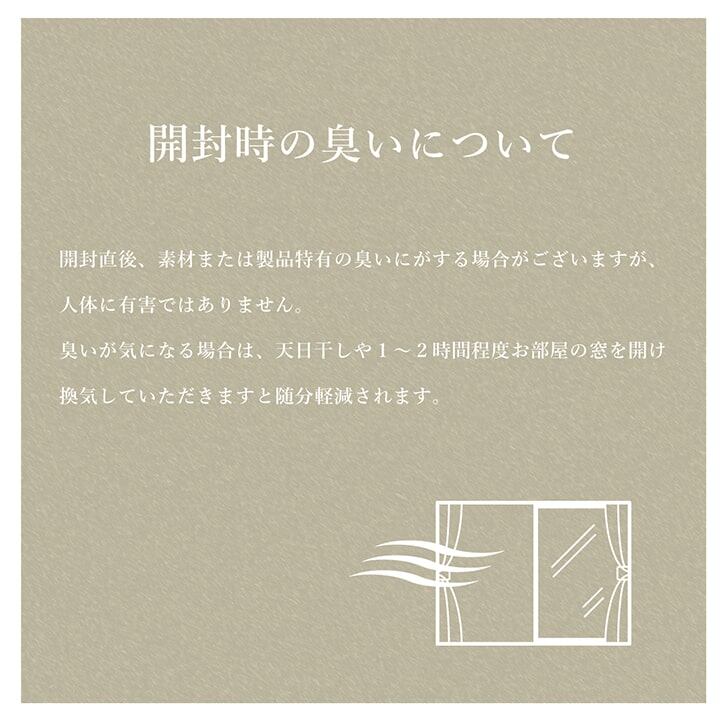 素材または製品特有の臭いにより、ご使用当初はにおいがする場合がございますが、人体に有害ではありません。天日干しや一日に1〜2時間程度お部屋の窓を開けて換気していただきますと1〜2週間で随分軽減されます。
