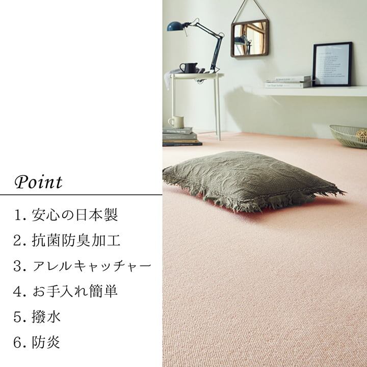 安心の日本製カーペットです。表地には撥水加工を施しておりますので,汚れにくくお手入れも簡単です。表地のパイル部分にはナイロンを使用しています。ナイロンは強度や摩耗に強く,速乾性があり,また遊び毛も出にくいなどの特徴があります。敷き詰めカーペットとしてのご使用にも適しています。抗菌防臭機能付きで,季節を選ばずオールシーズンご使用頂けます。安心の防炎加工です。フローリングを傷つけにくいよう,裏には不織布を貼っております。