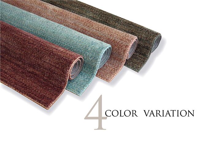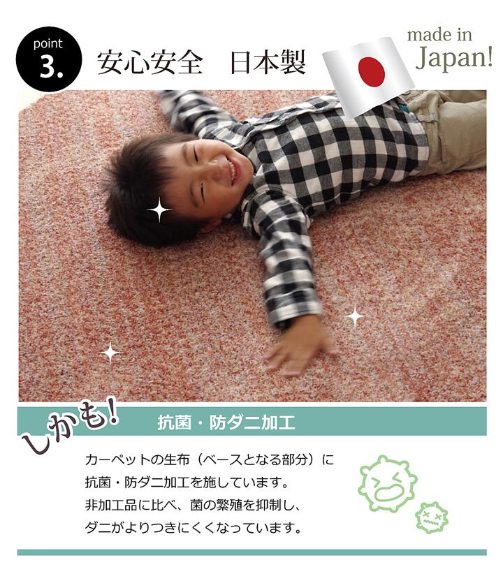 安心の日本製ふんわり多色MIXタフトラグです。多色多サイズ展開、お部屋に合わせてお選び下さい。基布には抗菌・防臭・防ダニ加工を施しておりますので、お子様にも安心です。パイル長約15mm、目付は1平方メートルあたり840gのボリュームタイプです。触っても基布が見えないくらいのふかふか、モコモコのボリュームを実感して下さい。パイル部分はレベルカット加工(表面をフラットにする加工)を施しておりますので、ふんわり柔らかい肌触りです。ホットカーペット、床暖房対応にも対応しています。