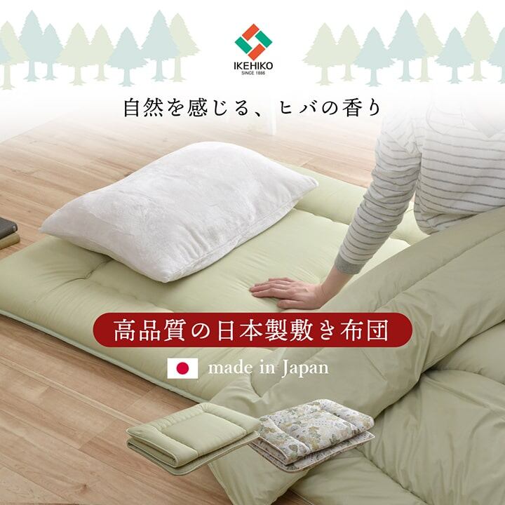 肌触りがよく、季節を問わず使用できます。中わたに東洋紡の特殊なわた、フィルハーモニィを使用しています。特長は①吸汗・速乾性 特殊表面処理により吸汗性は洗濯後も性能は変わりません。コットンに比べ乾燥が早く、いつまでも衛生的です。②抗菌・防臭性 細菌が分解したものや、細菌の産出する物質を軽減でき、臭気を抑えることができます。また、抗菌防臭効果を得るために繊維に練り込まれている抗菌剤はSEKで定められた認証基準に合格しています。③防ダニ性・増殖抑制効果などがあります。 表面にヒバエッセンスを使用しています。青森県のヒバの木から抽出した「ヒバエッセンス」をメーカー独自の技術で生地表面に加工しました。ヒバエッセンスにはヒノキチオールという、天然物質としては極めて抗菌性の高い成分が含まれています。(無加工品に比べ、抗菌・防臭効果があります。)