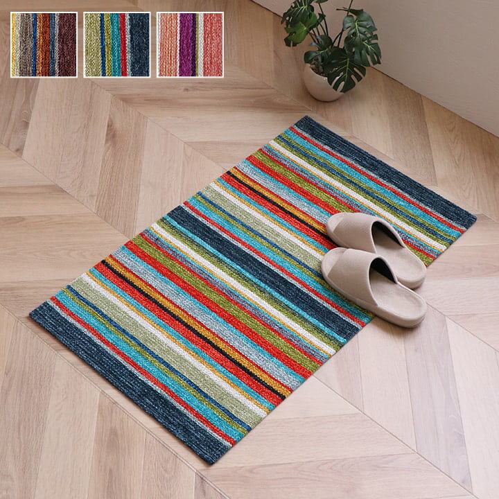 明るいデザインの玄関マットです。先染めタイプのため、色落ちもしにくく色合いも鮮やかです。薄めのタイプになるので、つまずいてしまう心配もございません。裏地には滑りにくく合成ゴムを使用しています。手洗いで、じゃぶじゃぶ洗うことが可能です。玄関だけでなく、ベッドサイドやソファー前などお部屋のワンポイントとしてもご使用できます。
