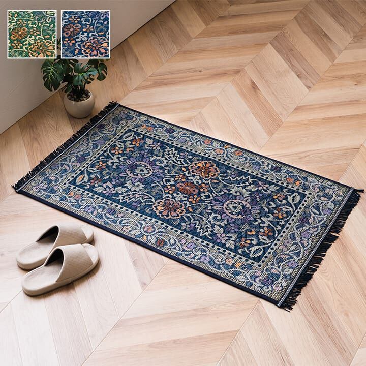 縦糸の本数が多い袋織りという技法で繊細な柄を出しています。折れ曲がりが複雑なので長いイ草を使用しないと切れてしまいます。縦糸が密なので、しっかりとして破れにくいのが特徴です。九州産のい草を使用しています。一本一本が太く、表皮が厚く繊維がキメ細かいので弾力性があり、耐久性に優れています。い草には空気の自然浄化作用、湿度の調節作用などがあります。また汚れにくく、使用するうちに黄金色に変化し味が出ます。青森ヒバ加工を施しています。(抗菌、防臭効果)裏には適度なクッション性があり、滑りにくい国産のウレタンを貼っています。サイドは高級感の出るフリンジ付きです。