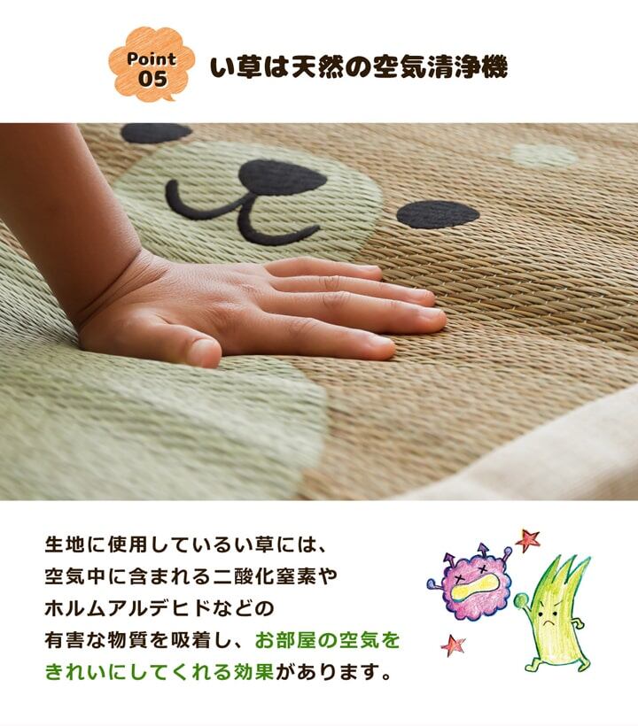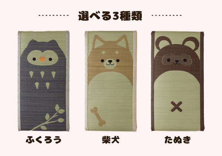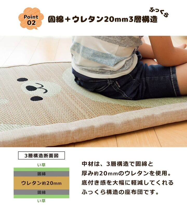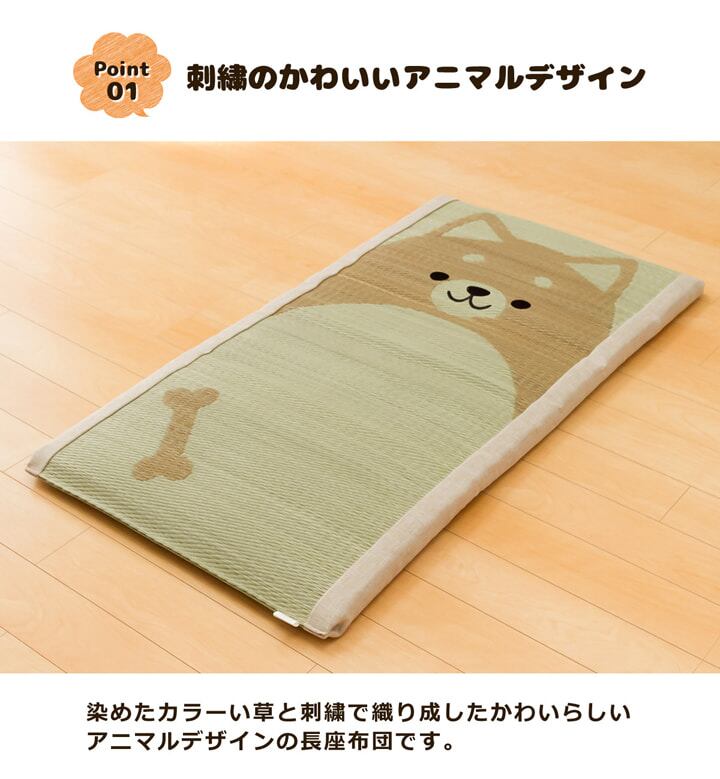 ござのアニマル?!略して「 ござまる 」です。人気のアニマル柄をい草で表現しました。い草の効能として1.綿の約2.5倍の吸湿力 2.蒸れにくい。 3.汗のにおいを軽減。汗のにおいの元となる化学物質を90%以上抑えます。通常の座布団より、長いサイズの商品です。ソファー上用の座布団、お昼寝タイムやおくろぎタイムの際に、枕替りに置いてご使用されるのに最適です。