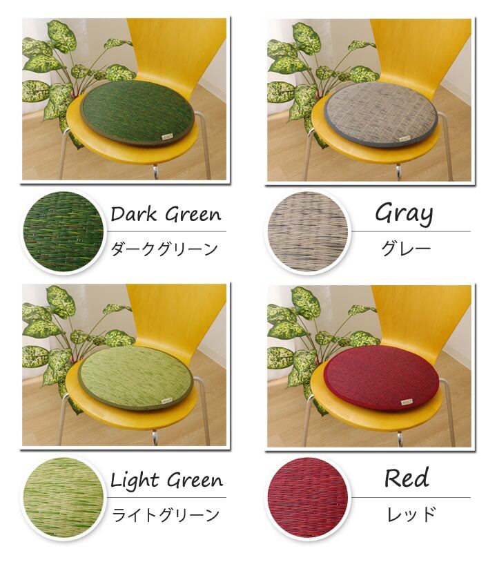 シンプルで、フローリングやソファー、チェアに合わせやすいカラー8色展開です。単色ではなく、3色の色を混ぜることにより、深みのある色合いになっています。中材にはチップウレタン30mmを使用しています。柔らかすぎず、ぷにぷにとした適度なクッション性があります。通常の紋織の1.5倍イ草を打ち込んだ三重織のイ草チェアパッドです。国産(九州産)のい草を使用しています。一本一本が太く、表皮が厚く繊維がキメ細かいので弾力性があり、耐久性に優れています。い草には空気の自然浄化作用、湿度の調節作用などがあります。またイ草は汚れにくいのも特長です。イ草に青森ヒバ加工を施しています(抗菌、防臭効果)。青森県の「ヒバの木」から抽出した「ヒバ油」をメーカー独自の技術で材料や商品に加工しました。「ヒバ油」には、ヒノキチオールという天然物質としては極めて抗菌性の高い成分が含まれ、医療や食品など多分野で利用研究が進められています。