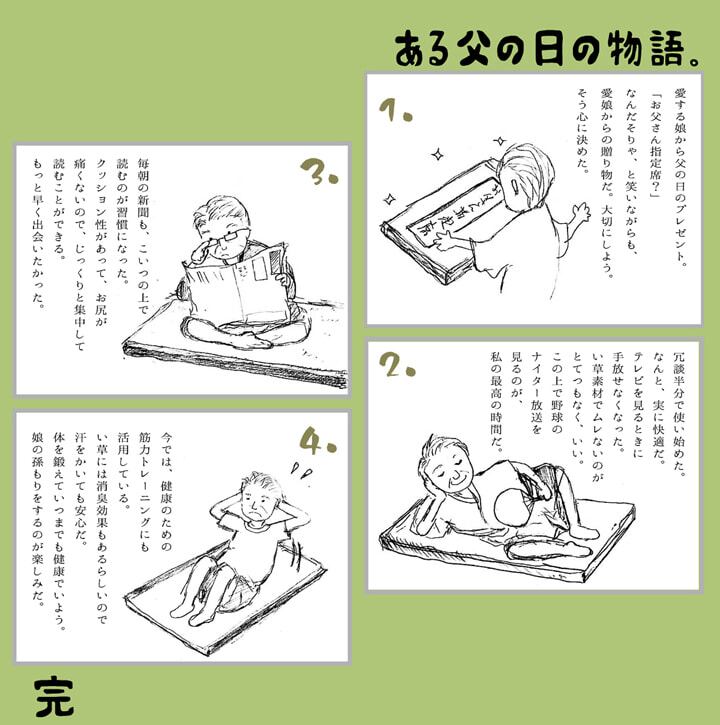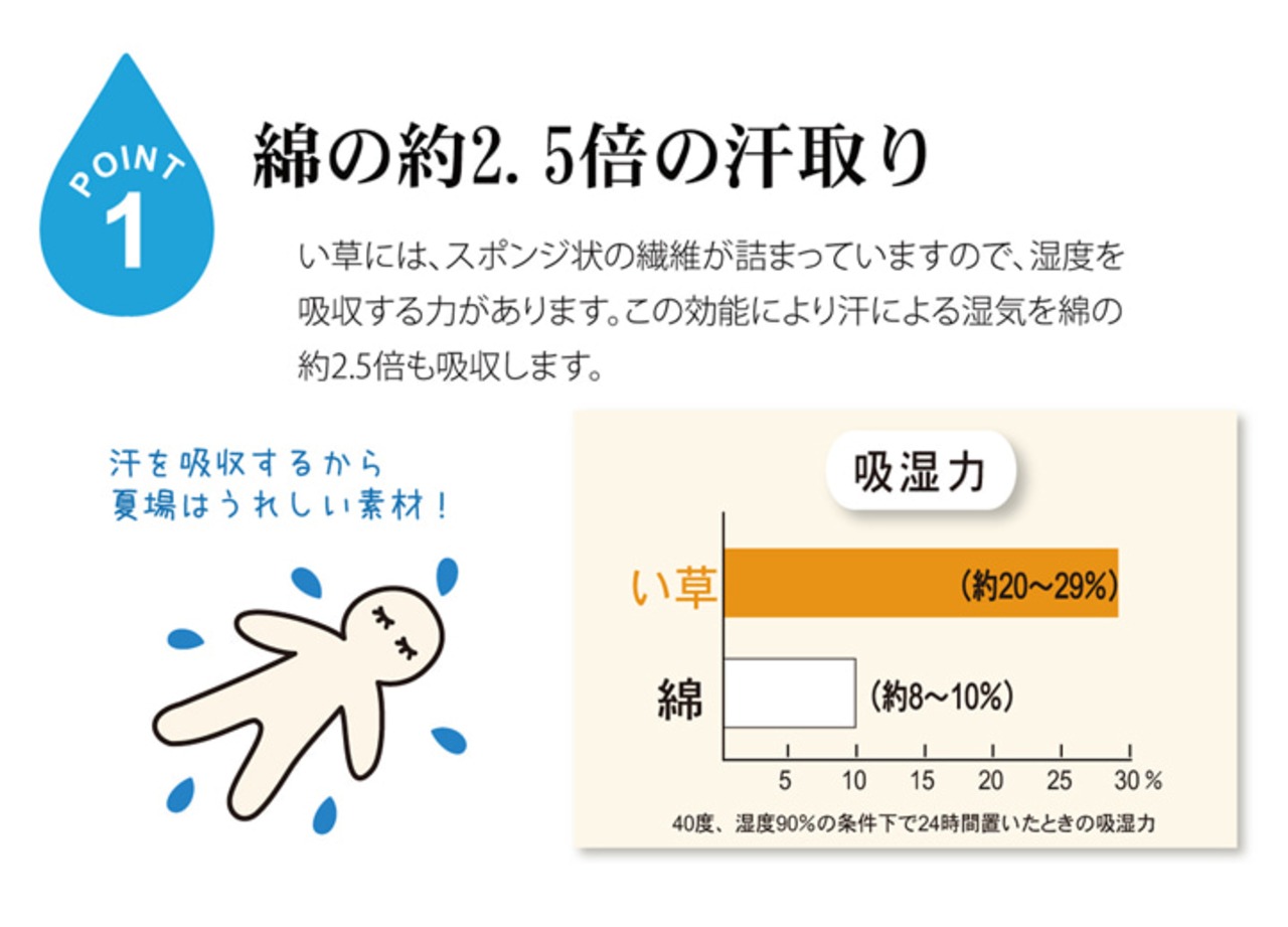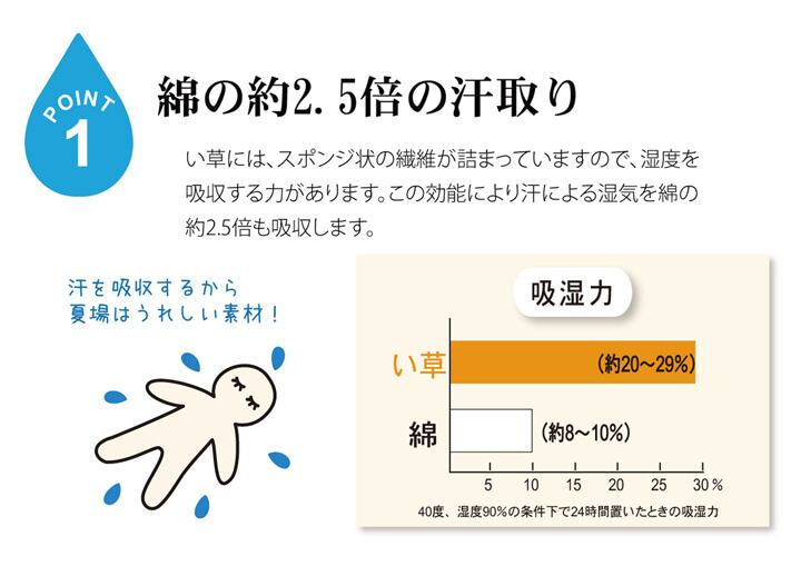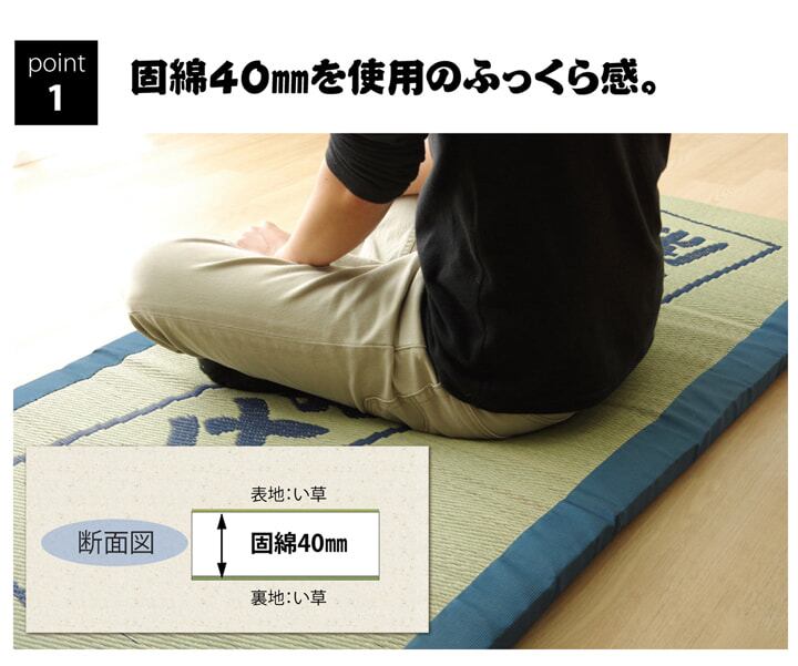 寝っころがってテレビを見たり、折りたたんで腰かけたり、リビングでのお昼寝用に、などいろいろな使い方ができるフリーマットです。い草には1.綿の約3倍の吸湿性があり汗のじめじめを軽減します。2.湿度の調整作用があり、蒸れにくく快適な就寝を促します。3.汗のにおいの元となる化学物質を90%以上抑え、においを軽減します。などの効果があります。中材には固わた40mmを使用していますのでフローリングでも快適にご使用頂けます。い草に青森ヒバ加工を施しています。(抗菌・防臭効果)