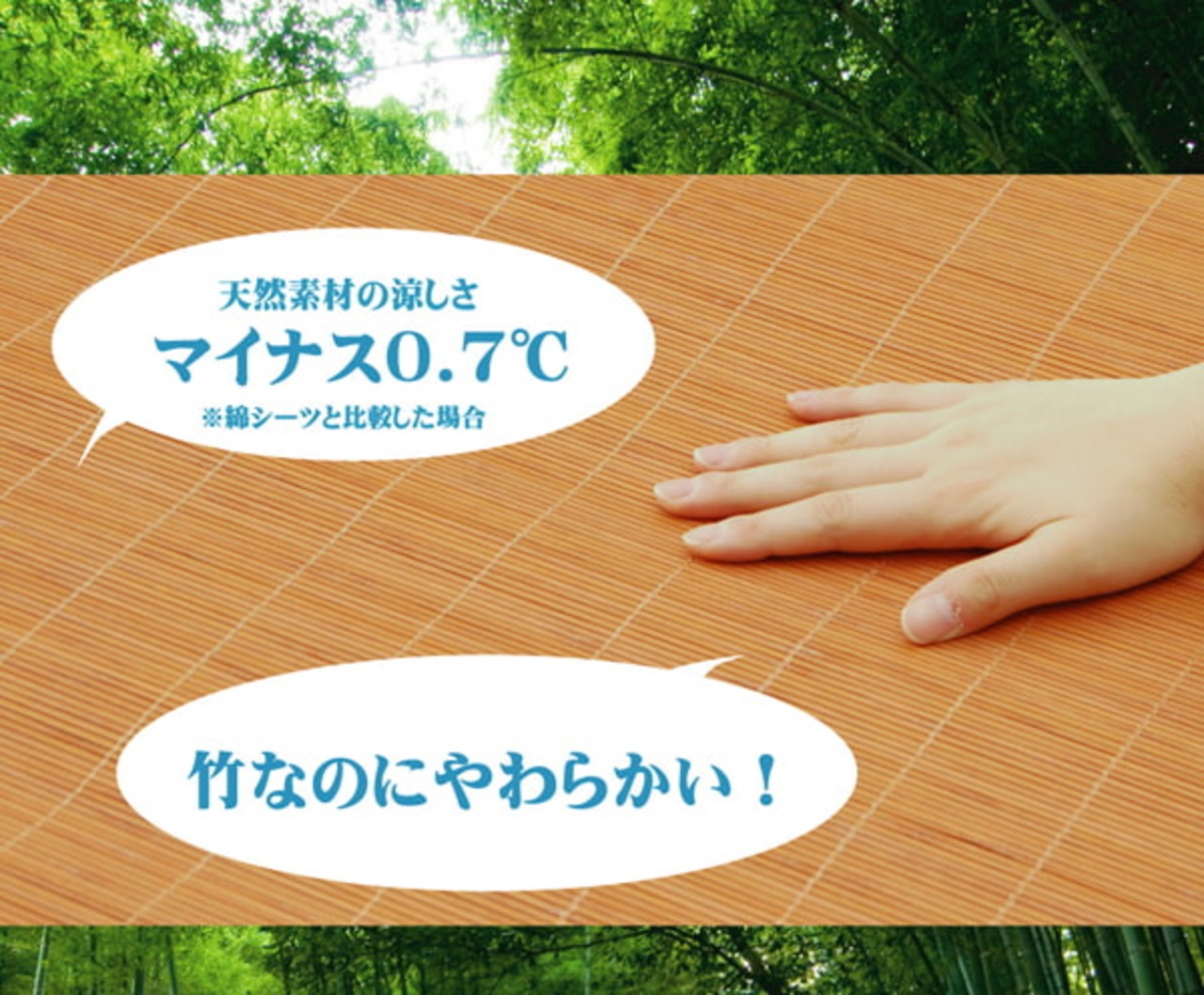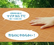 素材は皮下2.6mm竹ヒゴを使用しています。汚れにくく、耐久性に優れ、熱伝導率が高いため、ひんやり感も抜群です。竹表面をプレスしているので高さが揃っており、つるつるとした肌触りです。四隅にはゴムバンド付きです。竹は他の木材と比べると格段に成長が早く(3〜5年で成竹)、持続的生産が可能な環境に優しいサスティナブルな素材です。