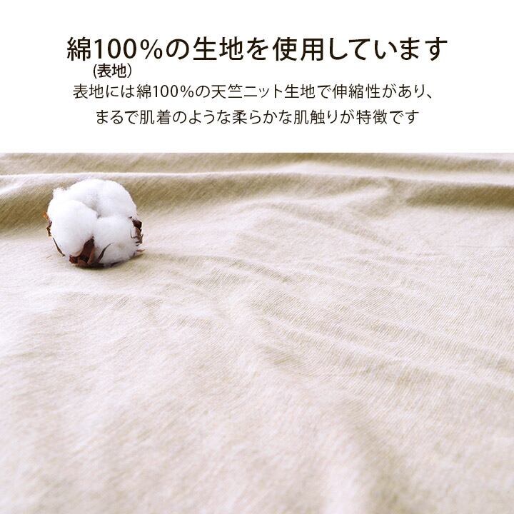 綿100%の天竺ニット生地で伸縮性があり、まるで肌着のような柔らかな肌触りが特徴。