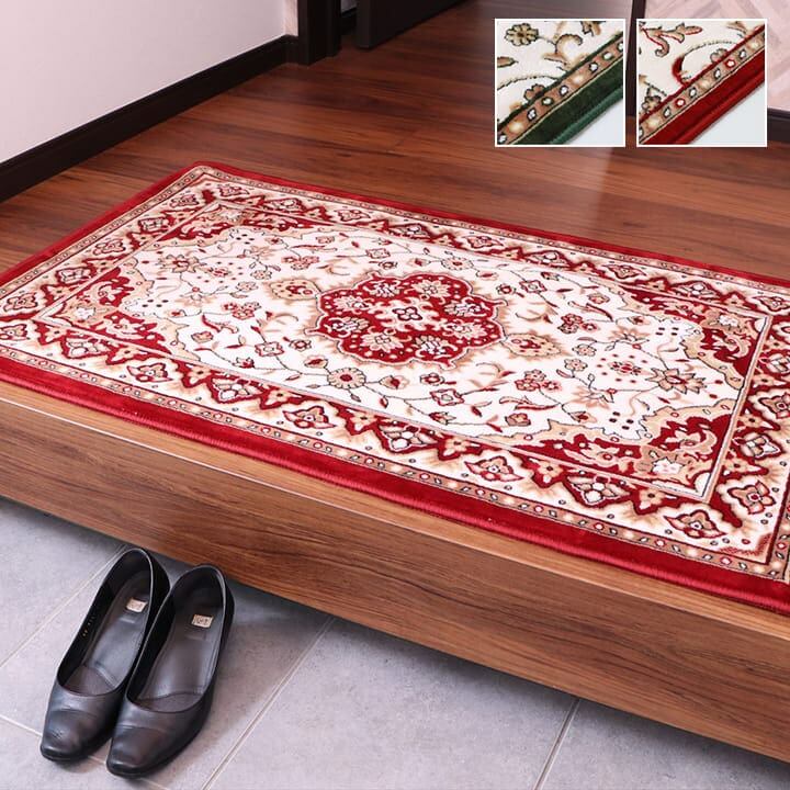 上品なクラシック柄の玄関マットです。高密度で織り上げることで、丈夫で繊細な柄を表現しました。上品な玄関を演出してくれます。あがり框サイズまである他サイズ展開商品です。裏面にはすべりにくい加工を施しています。
