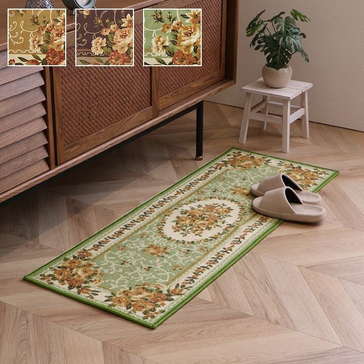 絵羽柄のカーペットです。表地には撥水加工を施しておりますので、汚れにくくお手入れも簡単です。表地のパイル部分にはナイロンを使用しています。ナイロンは強度や摩耗に強く、速乾性があり、また遊び毛も出にくいなどの特徴があります。季節を選ばず、オールシーズンご使用頂けます。同柄のラグサイズ・敷き詰めサイズも取扱いがありますので、トータルでのコーディネートもお勧めです。フローリングを傷つけにくいよう、裏には不織布を貼っております。※キッチンマットサイズのみ滑りにくい加工を施しています。