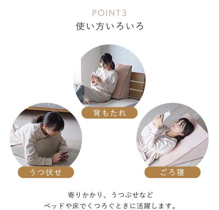 寄りかかり、うつぶせ等、ベッドでくつろぐときに便利なアイテムです。