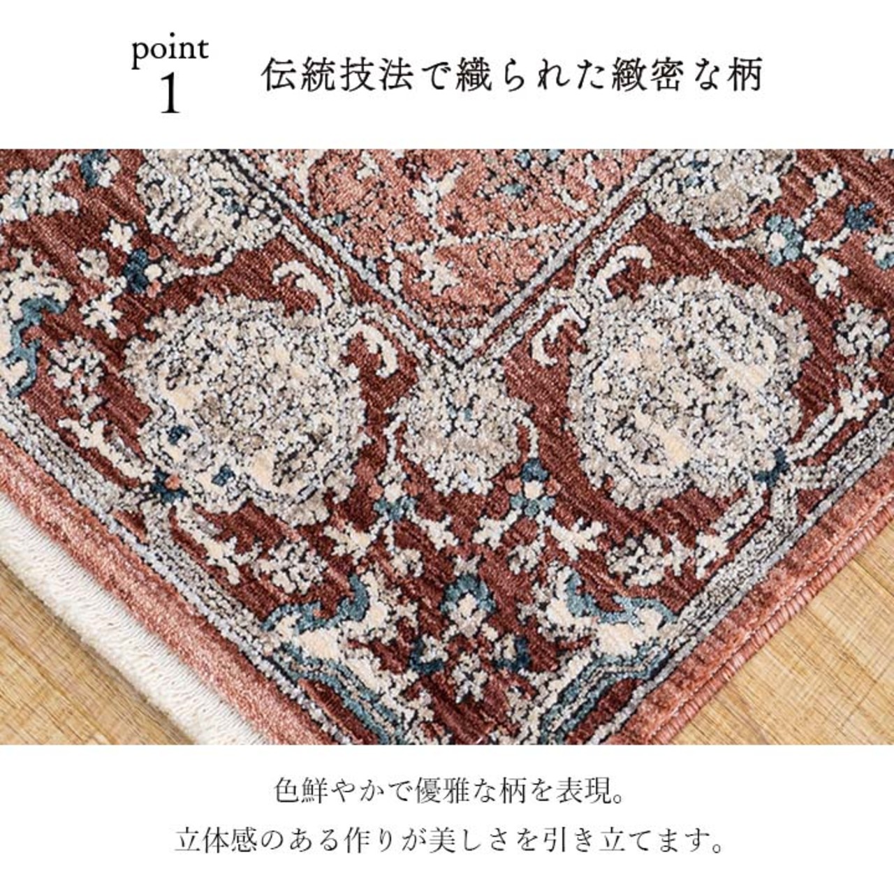 一般的なウィルトンマットは目付が約30万ノット前後の商品ですが、この商品はその約3倍強の100万ノットの調高目付で織り上げられたマットです。