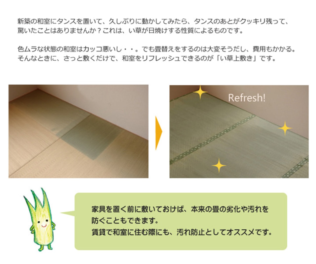 上敷きを敷くだけで畳のお部屋をリフレッシュ出来ます。日焼けしてしまった畳のリフレッシュに、新品の畳を汚さないためのカバーにご使用下さい。お部屋の形に合わせて簡単にカットできる、フリーカットタイプです。裏にはウレタンを貼っていますので適度なクッション性があります。長さ110〜115cmの国産(九州産)い草を使用しています。そのうち約95cmを使用しています。ヘリ際はある程度白みを帯びます。(白い部分は日焼けではありません、い草の根元と先端部分の色です。)い草は長いものほど高級になります。い草は先端部分が赤茶色く、根元が白く真中が青(緑)色です。真中の良質な青の部分を多く使用するほど、丈夫で綺麗な仕上がりとなります。またイ草は使用するうちに日焼けをしますが、真中の青の部分を多く使用したものほど、全体が綺麗にムラなく日焼けし、味が出ます。国産(九州産)のい草を使用しています。国産い草は一本一本が太く、表皮が厚く繊維がキメ細かいので弾力性があり、耐久性に優れています。い草には空気の清浄化作用、湿度の調節作用があり、汚れにくいといった特徴があります。い草に青森ヒバ加工を施しています。(抗菌、防臭効果)