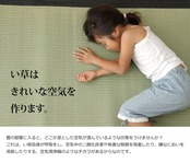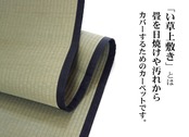 見た目の美しさと耐久性にこだわり抜いた上敷きです。経糸に麻糸と綿糸を使用し、通常の糸引織の2倍の糸量を使用しています。麻糸と綿糸を合わせることで糸自体が非常に丈夫になります。また一本一本が太くなるため、織り上げた際にはっきりと織りの凹凸が出て非常に綺麗です。上敷きを敷くだけで畳のお部屋をリフレッシュ出来ます。日焼けしてしまった畳のリフレッシュに、新品の畳を汚さないためのカバーにご使用下さい。通常畳表に使用される長さ135cm以上【JAS1クラス(畳表の中でも上クラス)】の国産(イ草の産地熊本県八代産)い草を使用しています。厳選された良質の太く長いイ草を高密度に織り込んでおりますので、丈夫で耐久性があり、素肌に心地よいボリューム感があります。長さ130cmのうち約88cmを使用しています。ヘリ際の白い部分が少ない、長いイ草を使用した高級な商品です。(白い部分は日焼けではありません、い草の根元と先端部分の色です。)い草は長いものほど高級になります。い草は先端部分が赤茶色く、根元が白く真中が青(緑)色です。真中の良質な青の部分を多く使用するほど、丈夫で綺麗な仕上がりとなります。またイ草は使用するうちに日焼けをしますが、真中の青の部分を多く使用したものほど、全体が綺麗にムラなく日焼けし、味が出ます。こちらの商品は畳表と同じ織り方の糸引織で仕上げました。双目織りと比べて、い草の打ち込み本数が多いため丈夫です。表面が滑らかなので、ホコリなどがたまりにくいのが特徴です。長くご使用されたい方や、耐久性をお求めの方には糸引織をおすすめします。国産(熊本県八代産)のい草を使用しています。国産い草は一本一本が太く、表皮が厚く繊維がキメ細かいので弾力性があり、耐久性に優れています。い草には空気の清浄化作用、湿度の調節作用があり、汚れにくいといった特徴があります。青森県のヒバの木から抽出した「ヒバエッセンス」をメーカー独自の技術で生地表面に加工しました。ヒバエッセンスにはヒノキチオールという、天然物質としては極めて抗菌性の高い成分が含まれています。(無加工品に比べ抗菌、防臭効果があります。)表裏の両面が使えて経済的です。※自然素材であること、また職人が一つ一つ手作業にて加工を行うため、形状のバラツキや表示サイズと多少異なることがあります。ご了承下さい。