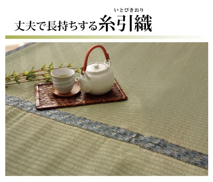 上敷きを敷くだけで畳のお部屋をリフレッシュ出来ます。日焼けしてしまった畳のリフレッシュに、新品の畳を汚さないためのカバーにご使用下さい。長さ115〜120cm程の国産(九州産)い草を使用しています。そのうち約88cmを使用しています。ヘリ際は多少白みを帯びます。(日焼けではありません、い草の根元と先端部分の色です。)い草は長いものほど高級になります。い草は先端部分が赤茶色く、根元が白く真中が青(緑)色です。真中の良質な青の部分を多く使用するほど、丈夫で綺麗な仕上がりとなります。またイ草は使用するうちに日焼けをしますが、真中の青の部分を多く使用したものほど、全体が綺麗にムラなく日焼けし、味が出ます。こちらの商品は畳表と同じ織り方の糸引織で仕上げました。双目織りと比べて、い草の打ち込み本数が多いため丈夫です。表面が滑らかなので、ホコリなどがたまりにくいのが特徴です。長くご使用されたい方や、耐久性をお求めの方には糸引織をおすすめします。国産(九州産)のい草を使用しています。国産い草は一本一本が太く、表皮が厚く繊維がキメ細かいので弾力性があり、耐久性に優れています。い草には空気の清浄化作用、湿度の調節作用があり、汚れにくいといった特徴があります。い草に青森ヒバ加工を施しています。(抗菌、防臭効果)表裏の両面が使えて経済的です。