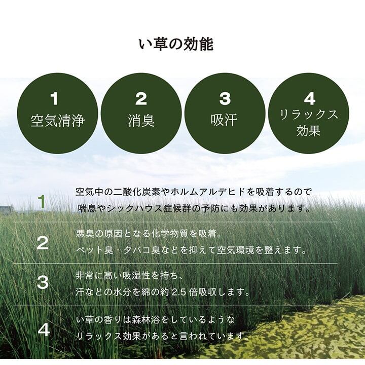 フローリングに置くだけ。なつかしい畳の香りと肌ざわりを手軽に楽しめます。い草には空気の自然浄化作用、湿度の調節作用などがあります。い草に、青森産天然ヒバ由来成分で抗菌防臭加工をほどこしています。(抗菌、防臭効果)中材は木製ボードタイプ+ポリエチレンで程よいクッション性と重量感があります。※ 掲載写真は表記サイズと異なる場合がございます。※ 画面上のカラーはご使用ブラウザやモニターの設定により、実物とは若干異なる場合がございます。あらかじめご了承の上、ご注文をお願いいたします。