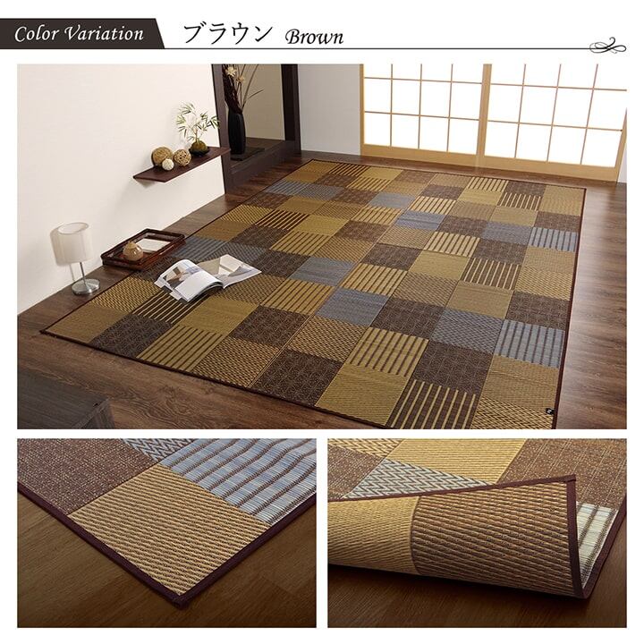 いろいろな織りを組み合わせたパッチワーク風のい草カーペットです。織り方によって違う複数の肌感触をお楽しみ頂けます。落ち着いた色目でモダンな雰囲気に仕上げました。縦糸の本数が多い袋織りという技法で繊細な柄を出しています。折れ曲がりが複雑なので長いイ草を使用しないと切れてしまいます。縦糸が密なので、しっかりとして破れにくいのが特徴です。国産(九州産)のい草を使用しています。一本一本が太く、表皮が厚く繊維がキメ細かいので弾力性があり、耐久性に優れています。い草には空気の自然浄化作用、湿度の調節作用などがあります。また汚れにくく、使用するうちに黄金色に変化し味が出ます。い草に青森ヒバ加工を施しています。(抗菌、防臭効果)
