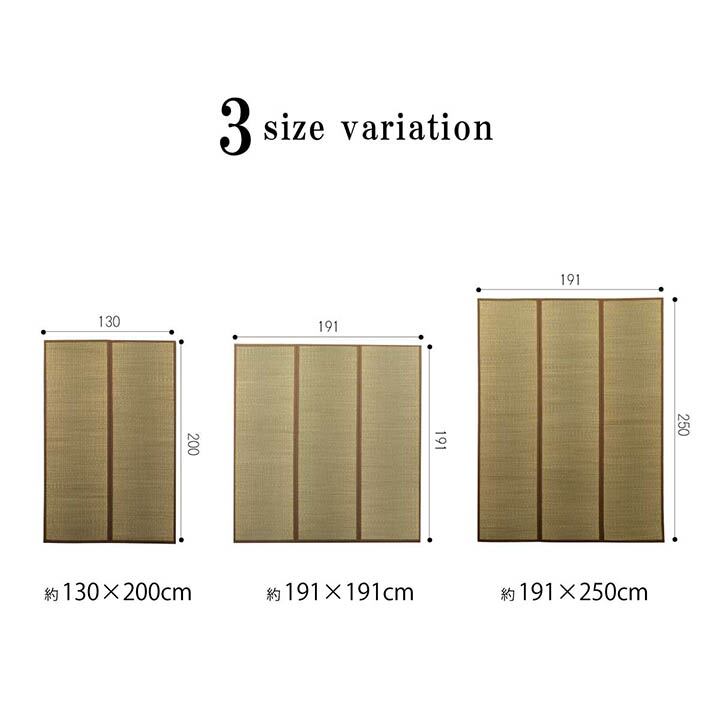 非常に希少価値の高い生地、「沖縄ビーグ」を使用したラグです。沖縄ビーグは通常のい草を原種としますが、何年もかけて沖縄の過酷な環境に適応した結果、太く丈夫に育ったい草の事を言います。本土のい草と比べ太さが約2〜3倍、重量も約2倍程あり丈夫で長持ちします。その為い草特有の機能である湿気の吸放出効果も約2倍程となり、夏場のムシムシとした湿り気を吸収してくれる他、寝転がった時の汗のべとつき感の無さも抜群です。長年仕様すると徐々に表面がきれいな飴色に変わり、まるでワックスをかけたかのような光沢感が生まれるのも特徴です。又、一番の特徴はその希少価値です。沖縄でしか生産は出来ず、作付面積もごく僅か、まず本土の店頭で入手する事は出来ません。裏地にはフローリングを気づ付けにくい様、滑り止め加工をした不織布を貼っています。匠の技が光る希少価値の高い一品、「良い物を長く使いたい」、「人とは違った物を使いたい」そんなあなたにピッタリの逸品です。