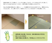 熊本県八代産減農薬栽培イ草100%使用の上敷きです。特徴として【①一般のイ草に比べ耐久性や弾力性に優れイ草特有の青さも長持ちします。②日焼けして退色が進んでもきれいなアメ色へと変化します。③大気汚染の原因にもなっている二酸化窒素を吸収する能力があり、またお部屋の湿度調整にも優れた働きをします。】上敷きを敷くだけで畳のお部屋をリフレッシュ出来ます。日焼けしてしまった畳のリフレッシュに、新品の畳を汚さないためのカバーにご使用下さい。通常畳表に使用される長さ130cm以上【JAS1クラス(畳表の中でも上クラス)】の国産(イ草の産地熊本県八代産)い草を使用しています。厳選された良質の太く長いイ草を高密度に織り込んでおりますので、丈夫で耐久性があり、素肌に心地よいボリューム感があります。長さ130cmのうち約88cmを使用しています。ヘリ際の白い部分が少ない、長いイ草を使用した高級な商品です。(白い部分は日焼けではありません、い草の根元と先端部分の色です。)い草は長いものほど高級になります。い草は先端部分が赤茶色く、根元が白く真中が青(緑)色です。真中の良質な青の部分を多く使用するほど、丈夫で綺麗な仕上がりとなります。またイ草は使用するうちに日焼けをしますが、真中の青の部分を多く使用したものほど、全体が綺麗にムラなく日焼けし、味が出ます。こちらの商品は畳表と同じ織り方の糸引織で仕上げました。双目織りと比べて、い草の打ち込み本数が多いため丈夫です。表面が滑らかなので、ホコリなどがたまりにくいのが特徴です。長くご使用されたい方や、耐久性をお求めの方には糸引織をおすすめします。国産(熊本県八代産)のい草を使用しています。国産い草は一本一本が太く、表皮が厚く繊維がキメ細かいので弾力性があり、耐久性に優れています。い草には空気の清浄化作用、湿度の調節作用があり、汚れにくいといった特徴があります。青森県のヒバの木から抽出した「ヒバエッセンス」をメーカー独自の技術で生地表面に加工しました。ヒバエッセンスにはヒノキチオールという、天然物質としては極めて抗菌性の高い成分が含まれています。(無加工品に比べ抗菌、防臭効果があります。)表裏の両面が使えて経済的です。※自然素材であること、また職人が一つ一つ手作業にて加工を行うため、形状のバラツキや表示サイズと多少異なることがあります。ご了承下さい。
