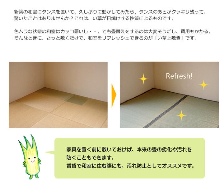 上敷きを敷くだけで畳のお部屋をリフレッシュ出来ます。日焼けしてしまった畳のリフレッシュに、新品の畳を汚さないためのカバーにご使用下さい。長さ110〜115cm程の国産(九州産)い草を使用しています。そのうち約95cmを使用しています。ヘリ際は強く白みを帯びます。(日焼けではありません、い草の根元と先端部分の色です。)い草は長いものほど高級になります。い草は先端部分が赤茶色く、根元が白く真中が青(緑)色です。真中の良質な青の部分を多く使用するほど、丈夫で綺麗な仕上がりとなります。またイ草は使用するうちに日焼けをしますが、真中の青の部分を多く使用したものほど、全体が綺麗にムラなく日焼けし、味が出ます。こちらの商品は畳表と同じ織り方の糸引織で仕上げました。双目織りと比べて、い草の打ち込み本数が多いため丈夫です。表面が滑らかなので、ホコリなどがたまりにくいのが特徴です。長くご使用されたい方や、耐久性をお求めの方には糸引織をおすすめします。国産(九州産)のい草を使用しています。国産い草は一本一本が太く、表皮が厚く繊維がキメ細かいので弾力性があり、耐久性に優れています。い草には空気の清浄化作用、湿度の調節作用があり、汚れにくいといった特徴があります。い草に青森ヒバ加工を施しています。(抗菌、防臭効果)表裏の両面が使えて経済的です。