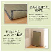 上敷きを敷くだけで畳のお部屋をリフレッシュ出来ます。日焼けしてしまった畳のリフレッシュに、新品の畳を汚さないためのカバーにご使用下さい。長さ110〜115cm程の国産(九州産)い草を使用しています。そのうち約95cmを使用しています。ヘリ際は強く白みを帯びます。(日焼けではありません、い草の根元と先端部分の色です。)い草は長いものほど高級になります。い草は先端部分が赤茶色く、根元が白く真中が青(緑)色です。真中の良質な青の部分を多く使用するほど、丈夫で綺麗な仕上がりとなります。またイ草は使用するうちに日焼けをしますが、真中の青の部分を多く使用したものほど、全体が綺麗にムラなく日焼けし、味が出ます。こちらの商品は畳表と同じ織り方の糸引織で仕上げました。双目織りと比べて、い草の打ち込み本数が多いため丈夫です。表面が滑らかなので、ホコリなどがたまりにくいのが特徴です。長くご使用されたい方や、耐久性をお求めの方には糸引織をおすすめします。国産(九州産)のい草を使用しています。国産い草は一本一本が太く、表皮が厚く繊維がキメ細かいので弾力性があり、耐久性に優れています。い草には空気の清浄化作用、湿度の調節作用があり、汚れにくいといった特徴があります。い草に青森ヒバ加工を施しています。(抗菌、防臭効果)表裏の両面が使えて経済的です。