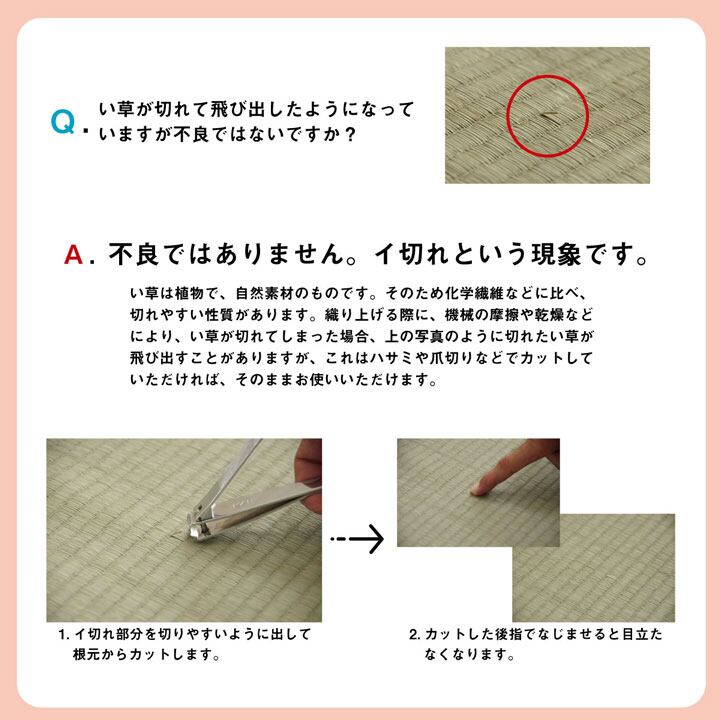 上敷きを敷くだけで畳のお部屋をリフレッシュ出来ます。日焼けしてしまった畳のリフレッシュに、新品の畳を汚さないためのカバーにご使用頂けます。天然素材のい草には、お部屋の空気をきれいにする空気清浄効果、お部屋の湿度を調整する調湿効果、汗臭、加齢臭、ペット臭などの嫌な臭いを消臭する消臭効果など優れた機能性があります。またこの商品には小林製薬社の持続性抗菌剤のKOBA-GUARDを使用し制菌、抗菌防臭効果もございます。長さ約100〜105cmのい草を使用しています。そのうち約88cmを使用しています。い草は使用するうちに日焼けをしますが、商品使用上問題はございません。表裏の両面が使えて経済的です。