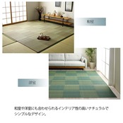 い草カーペットは和室の畳をカバーし、汚れや傷を防止してくれます。通常のカーペットと違い毛足が無いのでゴミや髪の毛などがからみにくく、掃除機やコロコロ(粘着シート)での掃除がラクにできます。い草には優れた消臭機能があり、汗臭やペット臭などの原因となる物質を消臭してくれます。い草には喘息の原因の一つとも言われる二酸化窒素や、シックハウス症候群の原因の一つのホルムアルデヒドを吸着してくれます。天然物質としては抗菌力の高い青森ヒバから抽出したヒノキチオールをい草生地に使用しており、抗菌防臭効果があります。い草の癒される香りとサラッとした肌触りはそのままに、和室や洋室にも合わせられるインテリア性の高いナチュラルシンプルなデザインで仕上げています。