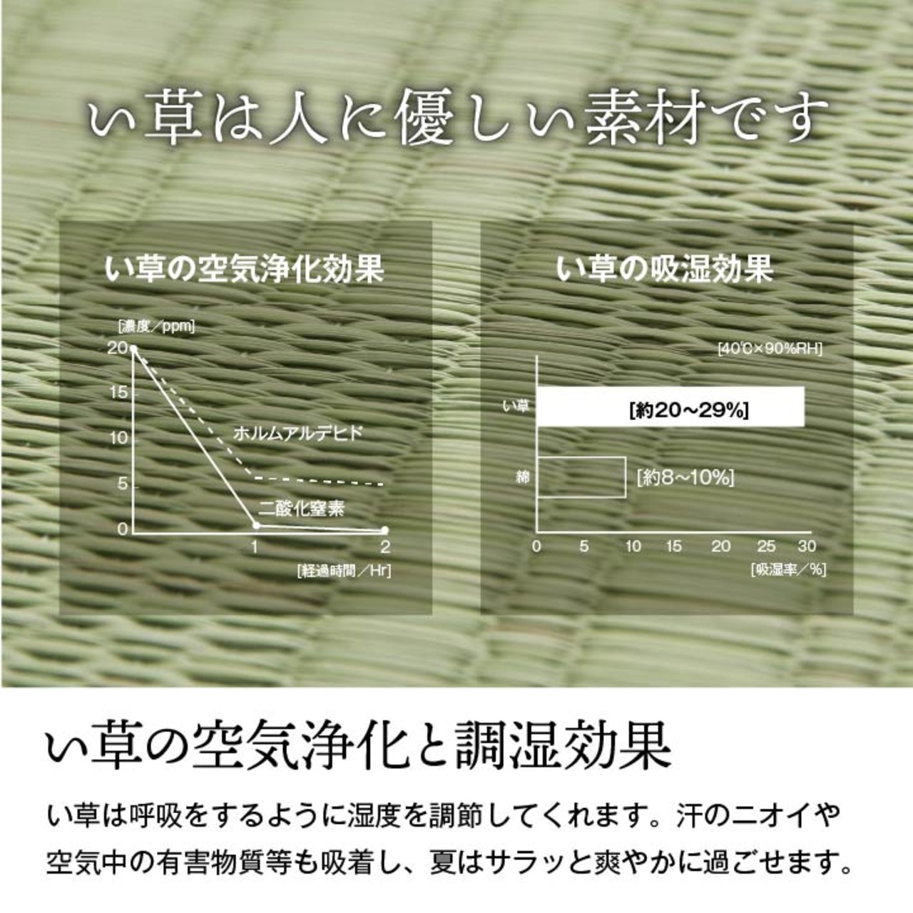 珍しい格子柄タイプの無地の上敷きです。上敷きを敷くだけで畳のお部屋をリフレッシュ出来ます。日焼けしてしまった畳のリフレッシュに、新品の畳を汚さないためのカバーにご使用下さい。長さ110〜115cmの国産(九州産)い草を使用しています。そのうち約91cmを使用しています。ヘリ際はある程度白みを帯びます。(日焼けではありません、い草の根元と先端部分の色です。)い草は長いものほど高級になります。い草は先端部分が赤茶色く、根元が白く真中が青(緑)色です。真中の良質な青の部分を多く使用するほど、丈夫で綺麗な仕上がりとなります。またイ草は使用するうちに日焼けをしますが、真中の青の部分を多く使用したものほど、全体が綺麗にムラなく日焼けし、味が出ます。国産(九州産)のい草を使用しています。国産い草は一本一本が太く、表皮が厚く繊維がキメ細かいので弾力性があり、耐久性に優れています。い草には空気の清浄化作用、湿度の調節作用があり、汚れにくいといった特徴があります。い草に青森ヒバ加工を施しています。(抗菌、防臭効果)表裏の両面が使えて経済的です。
