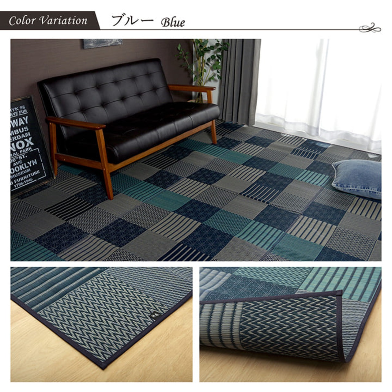 いろいろな織りを組み合わせたパッチワーク風のい草カーペットです。織り方によって違う複数の肌感触をお楽しみ頂けます。落ち着いた色目でモダンな雰囲気に仕上げました。国産(九州産)のい草を使用しています。一本一本が太く、表皮が厚く繊維がキメ細かいので弾力性があり、耐久性に優れています。い草には空気の自然浄化作用、湿度の調節作用などがあります。また汚れにくく、使用するうちに黄金色に変化し味が出ます。い草に青森ヒバ加工を施しています。(抗菌、防臭効果)