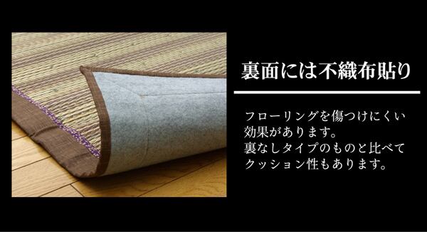 味のある深い色合いの無地縁と小花の縁を二重にする事で、まるで着物のような風合いを表現したい草ラグです。い草には空気の自然浄化作用、湿度の調節作用などがあります。また汚れにくく、使用するうちに黄金色に変化し味が出ます。い草に青森ヒバ加工を施しています。(抗菌、防臭効果)フローリングを傷つけにくいよう、裏には不織布を貼っています。