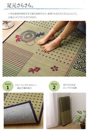 夏の風物詩、涼しげな金魚柄のい草ラグです。い草には空気の自然浄化作用、湿度の調節作用などがあります。フローリングを傷つけにくいよう、裏には不織布を貼っています。い草に青森ヒバ加工を施しています(抗菌、防臭効果)。青森県のヒバの木から抽出した「ヒバ油」をメーカー独自の技術で商品に加工しました。「ヒバ油」には、ヒノキチオールという天然物質としては極めて抗菌性の高い成分が含まれ、医療や食品など他分野で利用研究が進められています。