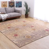 縦糸の本数が多い袋織りという技法で繊細な柄を出しています。折れ曲がりが複雑なので長いイ草を使用しないと切れてしまいます。縦糸が密なので、しっかりとして破れにくいのが特徴です。国産(九州産)のい草を使用しています。一本一本が太く、表皮が厚く繊維がキメ細かいので弾力性があり、耐久性に優れています。い草には空気の自然浄化作用、湿度の調節作用などがあります。また汚れにくく、使用するうちに黄金色に変化し味が出ます。い草に青森ヒバ加工を施しています。(抗菌、防臭効果)