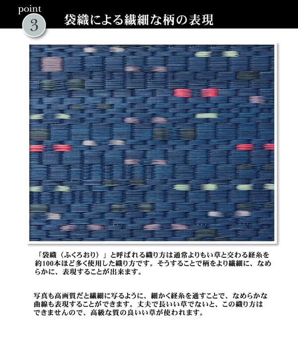 『柳川段通』シリーズのイ草カーペットです。柳川段通の特長として①厳選したイ草を通常の商品よりも約1.4倍(メーカー比)使用しています。②ヘリ生地は久留米織りの生地を使用しています。久留米織りとは福岡県久留米地方の伝統的な織りもので、着物や洋服によく使われている貴重な織りものです。③本商品の織り職人はこの道一筋20年〜40年の熟練の匠です。国産(九州産)のい草を使用しています。一本一本が太く、表皮が厚く繊維がキメ細かいので弾力性があり、耐久性に優れています。い草には空気の自然浄化作用、湿度の調節作用などがあります。また汚れにくく、使用するうちに黄金色に変化し味が出ます。い草に青森ヒバ加工を施しています。(抗菌、防臭効果)