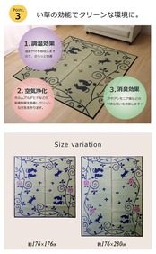 人気の黒猫をデザインしたい草ラグです。い草には空気の自然浄化作用、湿度の調節作用などがあります。フローリングを傷つけにくいよう、裏には不織布を貼っています。い草に青森ヒバ加工を施しています(抗菌、防臭効果)。青森県のヒバの木から抽出した「ヒバ油」をメーカー独自の技術で商品に加工しました。「ヒバ油」には、ヒノキチオールという天然物質としては極めて抗菌性の高い成分が含まれ、医療や食品など他分野で利用研究が進められています。
