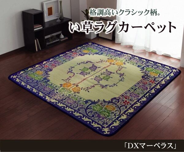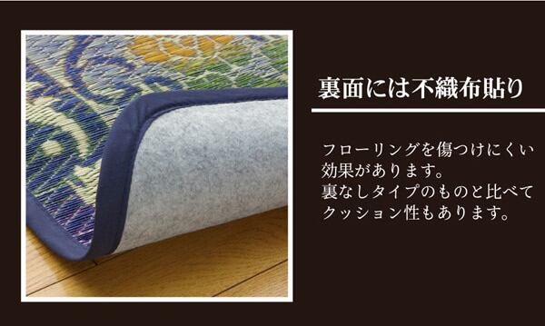 まるで絨毯のようなデザインを施したい草ラグです。い草には空気の自然浄化作用、湿度の調節作用などがあります。また汚れにくく、使用するうちに黄金色に変化し味が出ます。い草に青森ヒバ加工を施しています。(抗菌、防臭効果)フローリングを傷つけにくいよう、裏には不織布を貼っています。