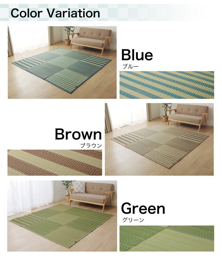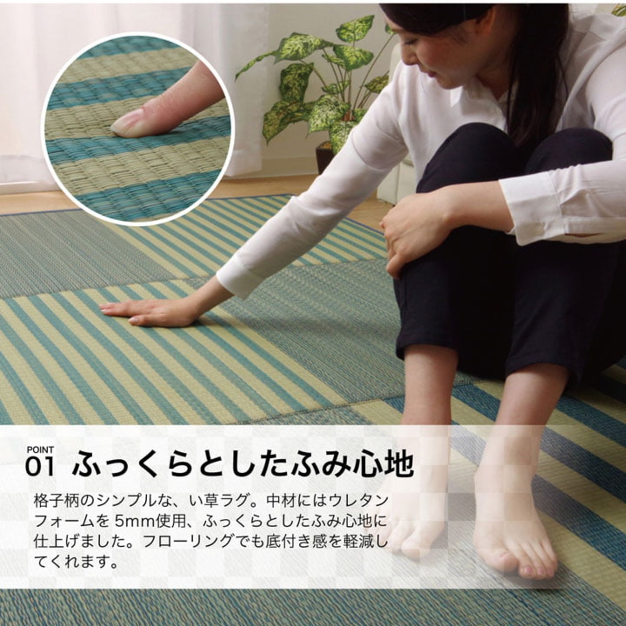 格子柄のシンプルない草ラグです。中材にはウレタンフォームを5mm使用し、ふっくらとしたふみ心地に仕上げました。フローリングでも底付き感を軽減してくれます。表地には撥水加工を施すことでちょっとこぼしてしまっても、さっと拭き取って清潔にご使用いただけるようにしました。またい草には空気の自然浄化作用、湿度の調節作用などがあります。こちらの商品はい草に青森ヒバ加工を施しています。(抗菌、防臭効果)