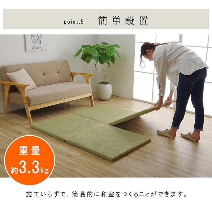 フローリングに置くだけで、なつかしい畳の香りと肌ざわりを手軽に楽しめます。